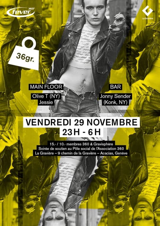 360 Fever est de retour à La Gravière vendredi 29 novembre pour une nouvelle édition des 36GR, les soirées de soutien aux activités sociales de l’Association 360. Ouverture à 23h et ambiance disco, house et techno dans les 2 salles avec dans la Main OLIVE T. (NY) et JESSIE, tandis que l’on retrouvera JONNY SENDER (Konk, NY) dans la salle du bar.