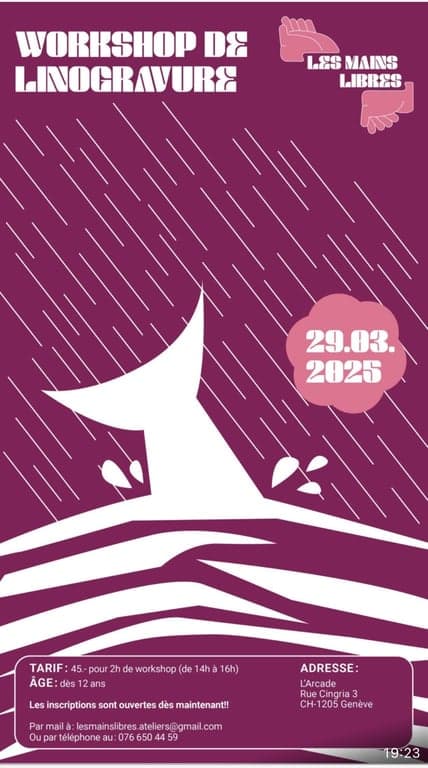 Atelier découverte de Linogravure. Samedi 29 mars 2025 de 14h à 16h à L'Arcade au 3 rue Cingria 1205 Genève, quartier Plainpalais. Dès 12 ans. | Calendrier genevois