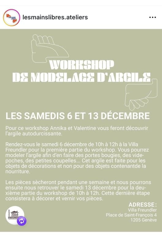 Pour enfants dès 6 ans, ateliers de modelage d’argile les samedis 6 et 13.12.2025 de 10 à 12h, Villa Freundler, Plainpalais. Tarif 35.- | Calendrier genevois