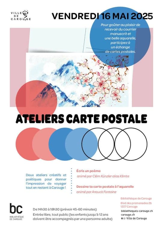 Entrée libre, tout public (les enfants jusqu’à 12 ans doivent être accompagnés d’une personne adulte) : https://www.bibliotheques-carouge.ch/Default/doc/CALENDAR/360/ateliers-carte-postale