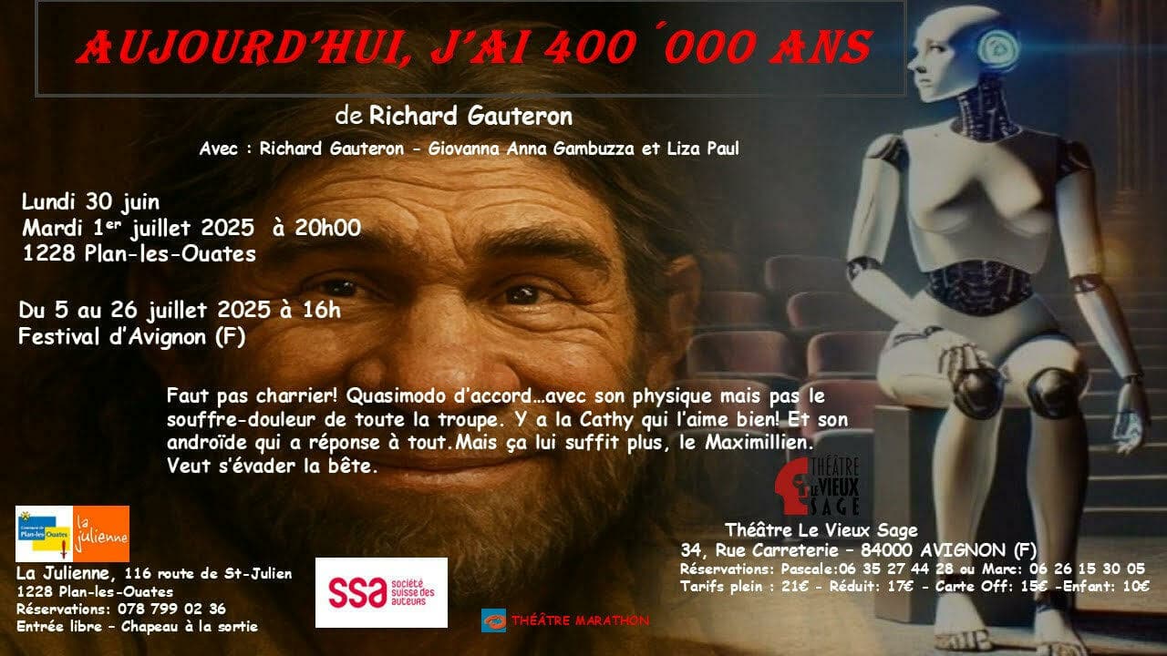 Une nouvelle pièce de et par Richard Gauteron s'intéressant à la préhistoire au tra-vers des tribulations d'un Néandertal confronté à l'IA dans une anticipation proche. Une comédie tendre, écologique, poétique, théâtrale!