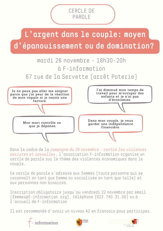 Dans le cadre de la campagne du 25 novembre - contre les violences sexistes et sexuelles (Genève, 2024), l’association F-information organise un cercle de parole sur le thème des violences économiques dans le couple.