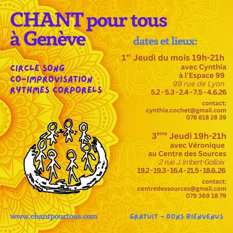 Exploration vocale, de l'échauffement vocal et corporel, des jeux, du rythme, du chant improvisé a capella, inspiré des circle songs et de la co-improvisation, ouvert à toutes à tous, dans un cadre bienveillant, pour créer ensemble.