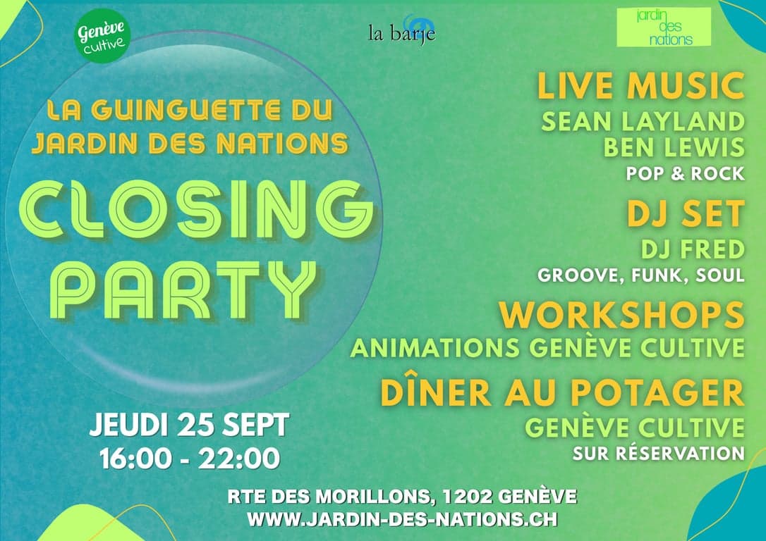 Pour clôturer cette belle saison, La Barje et Genève Cultive vous invitent à fêter ensemble la Closing Party de la Guinguette du Jardin des Nations.