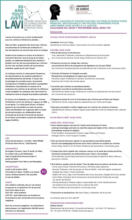 Ce colloque est organisé par le Centre genevois de consultation pour victimes d’infractions (Centre LAVI), la Faculté de droit de l’Université de Genève et le Centre universitaire romand de médecine légale (CURML).