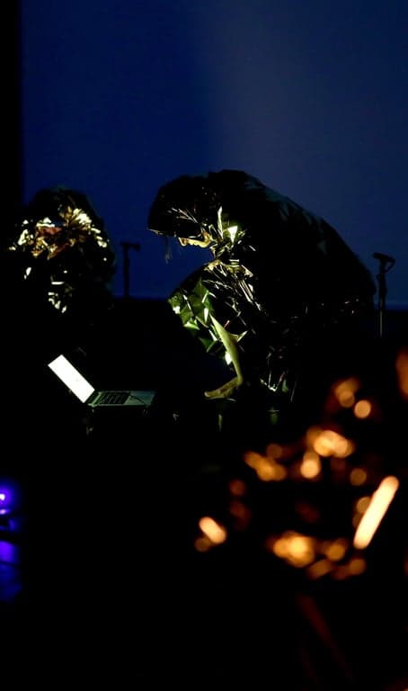 - Desplazados de Daniel Zea interroge quant à lui les formes contemporaines de déplacement et d’aliénation à travers un dispositif scénique saisissant : des couvertures de survie y deviennent instruments, surfaces sonores et symboles. Tremblements, masses liquides, visages filmés en direct, chaleur contrôlée… L’œuvre tisse une musique de la fragilité, hantée par la figure du migrant autant que par celle d’une société occidentale en voie de désintégration. Loin du pathos, elle propose une expérience corporelle et collective de tension, de saturation et de perte de contact.
