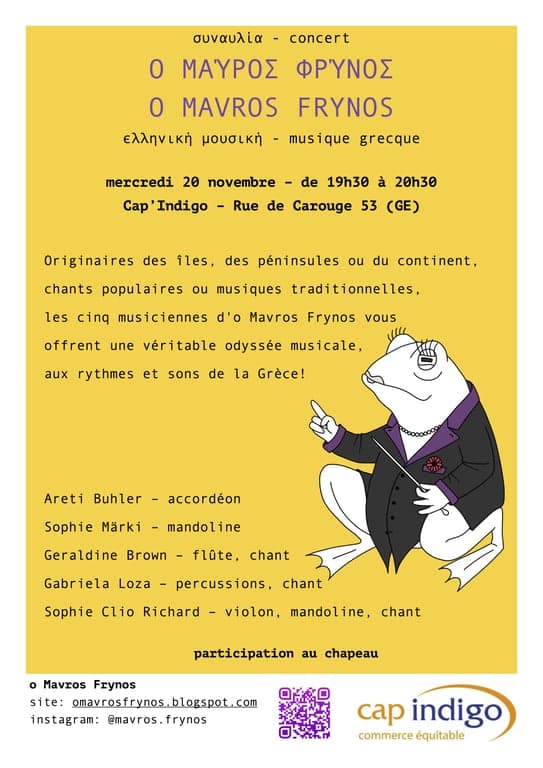 Musiques originaires des îles, des péninsules ou du continent, chants populaires ou musiques traditionnelles: les cinq musiciennes d'o Mavros Frynos vous offrent une véritable odyssée musicale, aux rythmes et sons de la Grèce!