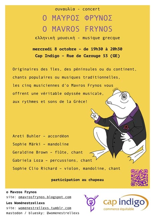 Originaires des îles, des péninsules ou du continent, chants populaires ou musiques traditionnelles: les cinq musiciennes d'o Mavros Frynos vous offrent une véritable odyssée musicale, aux rythmes et sons de la Grèce!