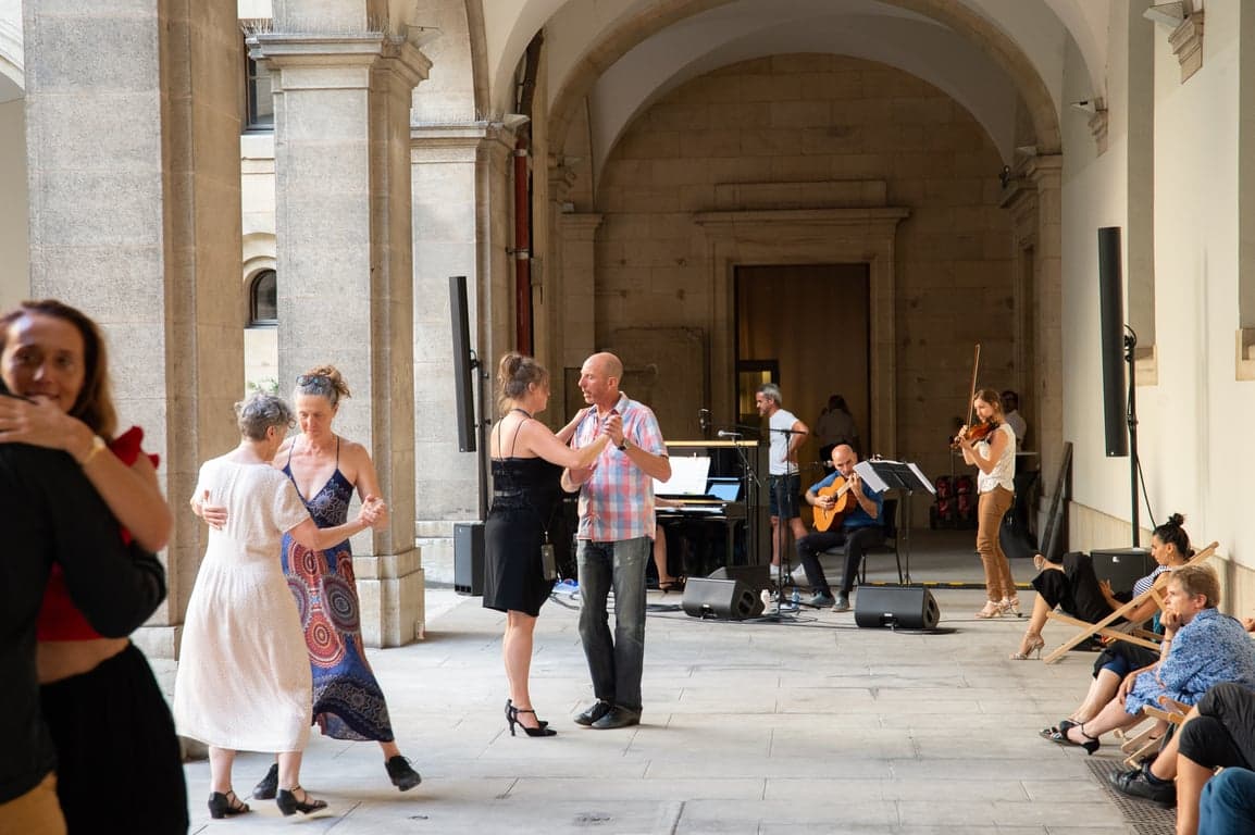 En juillet, les arcades de la cour semblent déplacées sur les rives du Río de la Plata... Les soirées tango commencent par une visite commentée, se prolongent par une initiation au tango et se concluent par un concert-milonga.