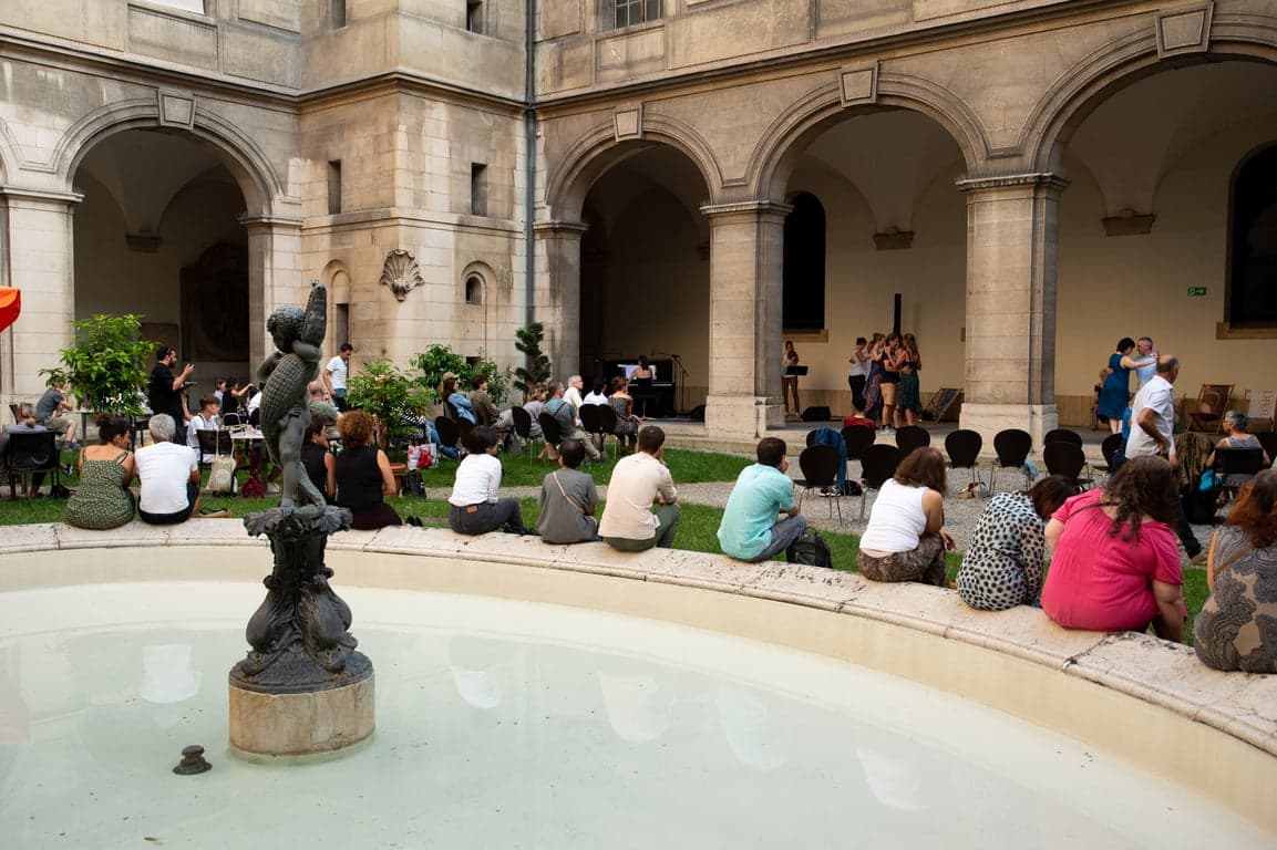 En juillet, les arcades de la cour semblent déplacées sur les rives du Río de la Plata... Les soirées tango commencent par une visite commentée, se prolongent par une initiation au tango et se concluent par un concert-milonga.