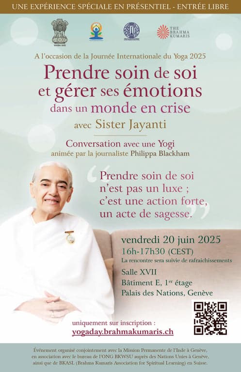 Dans un contexte mondial marqué par l’incertitude, les tensions et une crise émotionnelle généralisée, l’organisation spirituelle internationale Brahma Kumaris propose une rencontre inspirante à l’occasion de la Journée Internationale du Yoga 2025. Le vendredi 20 juin, de 15h30 à 17h30, le Palais des Nations à Genève accueillera Sister Jayanti, figure spirituelle de renommée mondiale, pour une conférence exceptionnelle : « Prendre soin de soi et gérer ses émotions dans un monde en crise ». Organisé en partenariat avec la Mission Permanente de l’Inde auprès des Nations Unies, le Consulat Général de l’Inde à Genève et les bureaux genevois des Brahma Kumaris, cet événement mettra en lumière le rôle essentiel de la méditation et de l’intelligence spirituelle pour traverser les défis du quotidien.
