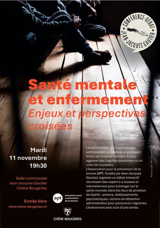 L’enfermement, qu’il soit carcéral, administratif ou médical, a un impact direct sur la santé mentale. Il peut aggraver des fragilités existantes ou en créer de nouvelles. L’Association pour la prévention de la torture (APT, fondée par Jean-Jacques Gautier) organise un débat interactif réunissant des expert·e·s suisses et internationaux pour échanger sur la santé mentale dans les lieux de privation de liberté.