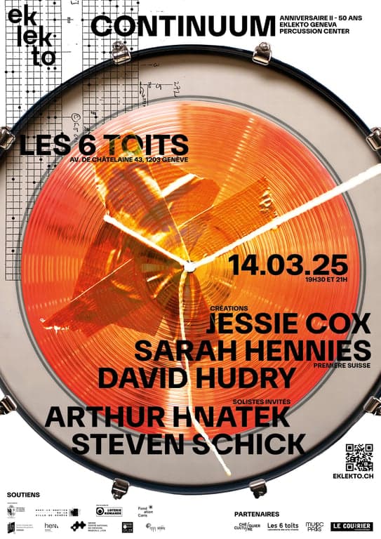 La pièce Timekeeper du compositeur David Hudry évoquera le temps et sa tentative de maîtrise par l'Homme, sous le jeu des percussionnistes du collectif genevois et du batteur Arthur Hnatek, invité solo. Jessie Cox, batteur américain, né en Suisse rejoindra les rangs de la programmation pour dévoiler sa nouvelle œuvre pour quinze percussionnistes, Sounds of Peace and Liberation, Endless Grounation interprétée par les étudiants de la HEM et Eklekto. Enfin à l'occasion de son récital en soliste, Steven Schick associera deux pièces, un classique de Iannis Xenakis, Psappha et une oeuvre de la compositrice Sarah Hennies, Thought Sectors.