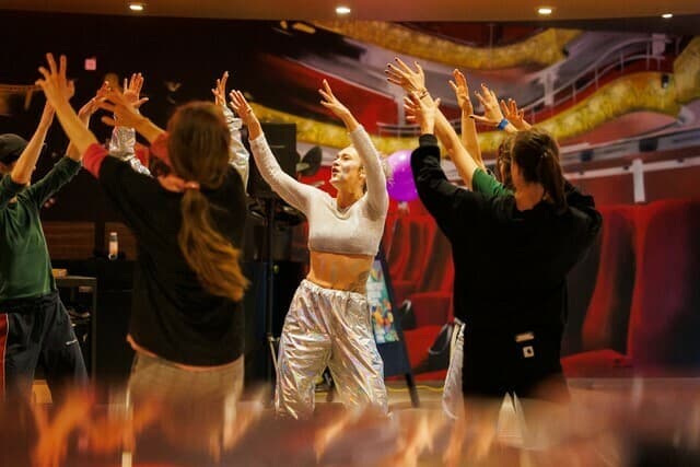 Le public se laisse prendre, répète les « steps » jusqu’à les incorporer collectivement. Au cours de l’événement, les mêmes chorégraphies reviennent à plusieurs reprises pour fédérer le public tout au long de la performance.