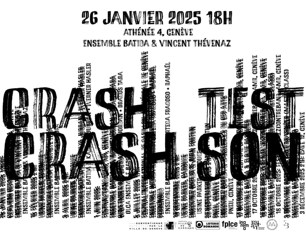Cette soirée ouvrira la saison 2025 "Après les horloges, l'intuition", avec un crAsh-test / crAsh-son, soirées pluri- esthétiques qui promeuvent et valorisent la recherche, l’expérimentation et l’improvisation. L’Ensemble Batida invite un·e artiste à présenter un projet en cours puis improvise avec l’invité·e. Plus de 30 soirées et environ 80 artistes ont été programmées depuis 2021.