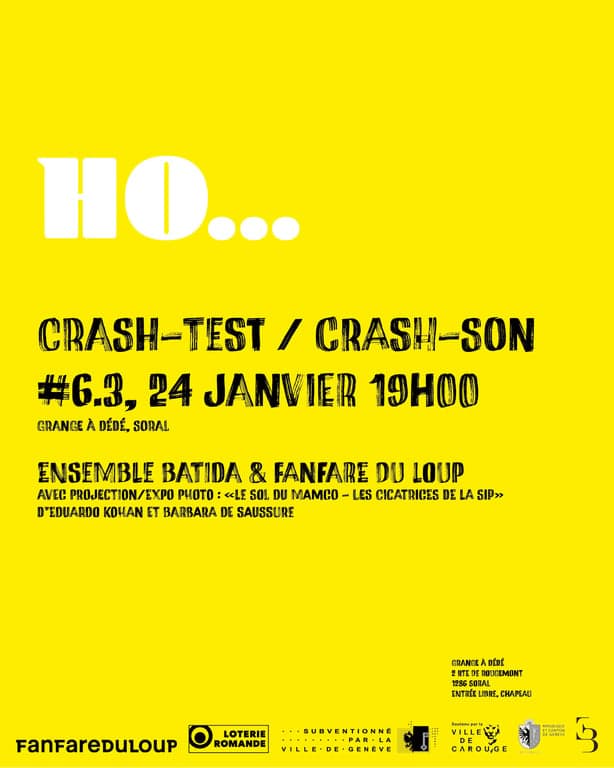 Un crAsh tout particulier, dans une magnifique grange du village de Soral! En première partie, notre invitée la FanfareduLoup nous présentera une composition autour du projet photographique de Barbara De Saussure et Eduardo Kohan “Le Sol du Mamco, les cicatrices de la SIP” (avec expo et projection). Puis, comme à son habitude, l'Ensemble Batida se joidra à la scène pour une rencontre improvisée en deuxième partie de soirée.