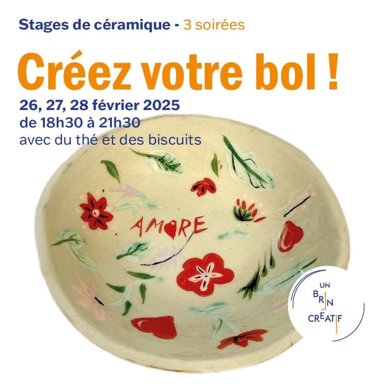 Stage de céramique adultes - 3 soirées 26, 27, 28 février 2025 de 18h30 à 21h30 avec du thé et des biscuits
