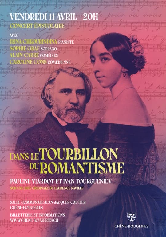 Ce concert épistolaire veut évoquer la longue relation affective qui s’étend sur près d’une quarantaine d’années, entre la chanteuse et compositrice Pauline Viardot (née Garcia) et l’écrivain russe Ivan Tourguéniev. Ces deux figures de l’époque romantique ont non seulement échangé une abondante correspondance mais aussi partagé le même toit. Au programme, des airs composés par Pauline Viardot et par Meyerbeer, Berlioz, Gounod, Saint-Saens, Chopin ou Liszt.