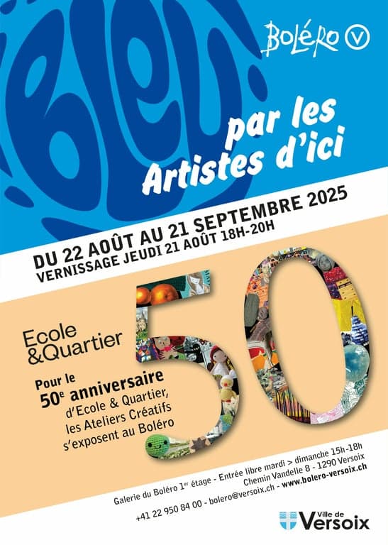 Cette année 18 artistes du collectif des Artistes d'ici ont choisi de travailler sur le thème du bleu. Peintures, dessins, photographies et sculptures nous réservent de belles découvertes ! En parallèle, les ateliers d'arts créatifs d'École & Quartier fêtent leurs 50 ans d'existence et exposent des œuvres de leurs élèves.
