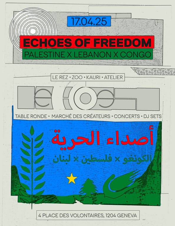 À travers cet événement – Echoes of Freedom: Palestine x Lebanon x Congo – nous souhaitons apporter un soutien concret aux peuples et aux associations mobilisées dans ces régions, et faire résonner, depuis Genève, un message de solidarité internationale.