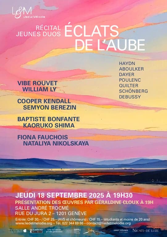 À l’aube d’une belle carrière, ces jeunes artistes talentueux vont nous régaler d’un beau programme composé du premier livre des fraîches Canzonettas de Joseph Haydn, des romantiques Fünf Lieder, Op. 40 de Robert Schumann sur les poèmes de Hans Christian Andersen, des célèbres Ariettes oubliées de Claude Debussy, de quelques truculents Brettl-Lieder d’Arnold Schönberg, des suaves Three Shakespeare Songs de Roger Quilter et de Deux poèmes de Guillaume Apollinaire, rêveurs et fantasques, de Francis Poulenc.