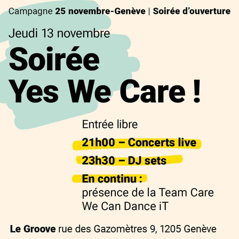 Ouverture de la Campagne 25 novembre-Genève en musique, avec un line-up mettant à l'honneur des artistes FINTA, concocté spécialement par Le Collectif Nocturne pour accompagner le lancement officiel de la Team Care professionnelle de We Can Dance iT.
