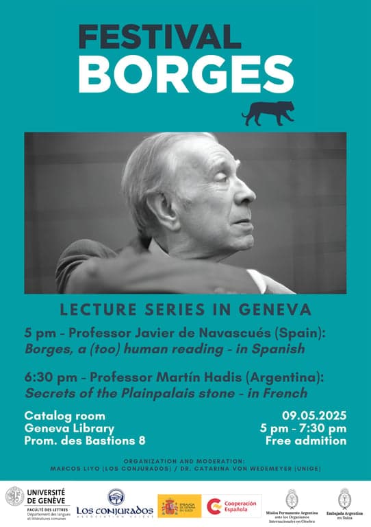 L'association suisse Los conjurados @losconjuradosdegeneve et l'Unité espagnole de la Faculté des Lettres de l'Université de Genève @espagnolunige présentent à cette occasion deux diffuseurs renommés de l'œuvre de Borges : l'universitaire espagnol Dr Javier de Navascués et le chercheur argentin Dr Martín Hadis @martinhadis.