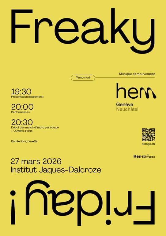 Organisé par le département de musique et mouvement de la HEM, la série des "Freaky Friday" propose un coup de projecteur sur l'improvisation lors de soirées participatives et conviviales. Chaque soirée s'ouvre sur une "carte blanche" confiée à un-e ou plusieurs invité-e-s musiciens/musiciennes et danseurs/danseuses, suivi d'une scène ouverte d'improvisation théâtrale. Un arbitre-maître de cérémonie anime la soirée et invite le public à évaluer les performances des participant-e-s. Une soirée sous le ton de l'humour, de la fantaisie et de l'humour.