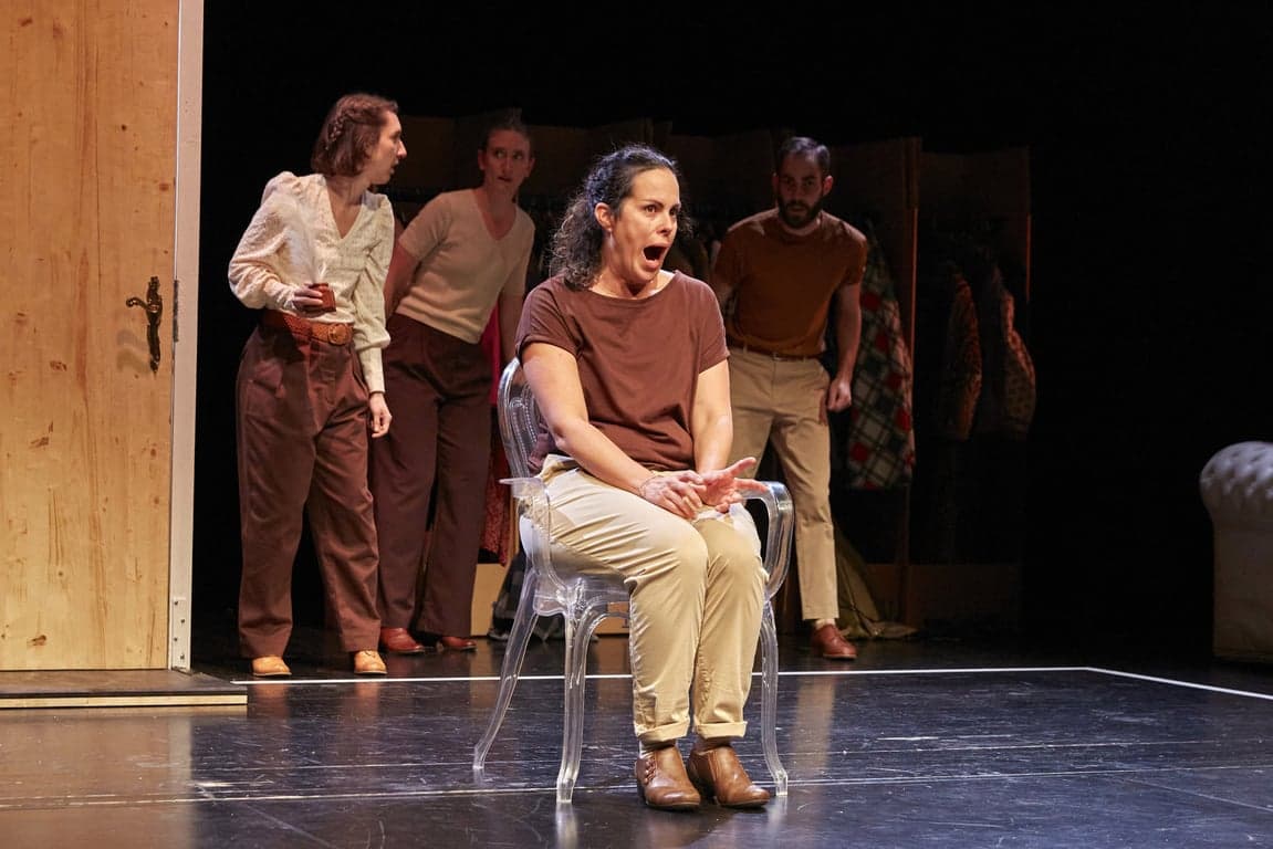Sur scène, les cinq acteurs se retrouvent dans le même pétrin que les personnages. Dans un élan commun, les interprètes se précipitent dans le chaos organisé et partagent avec le public cet art joyeux du déséquilibre.
