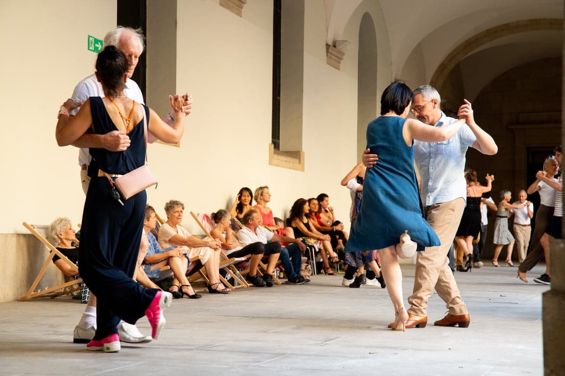 En juillet, les arcades de la cour semblent déplacées sur les rives du Río de la Plata... Les soirées tango commencent par une visite commentée, se prolongent par une initiation au tango et se concluent par un concert-milonga.