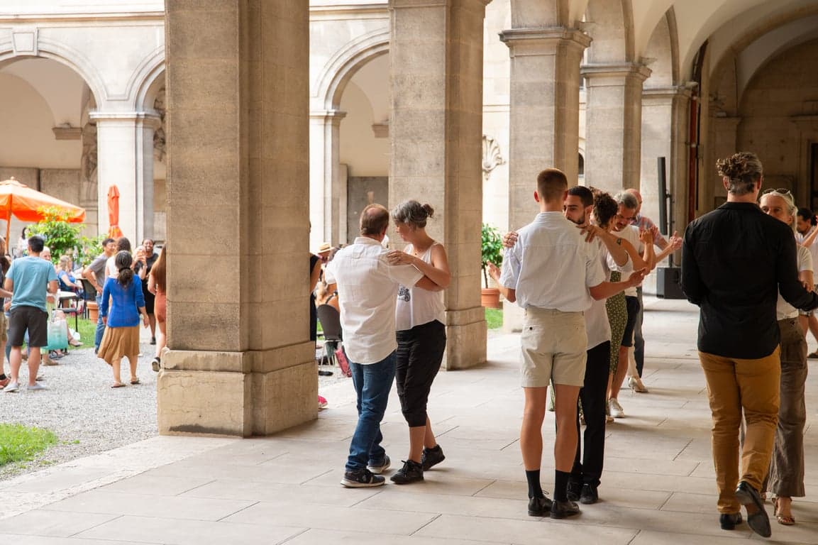 En juillet, les arcades de la cour semblent déplacées sur les rives du Río de la Plata... Les soirées tango commencent par une visite commentée, se prolongent par une initiation au tango et se concluent par un concert-milonga.