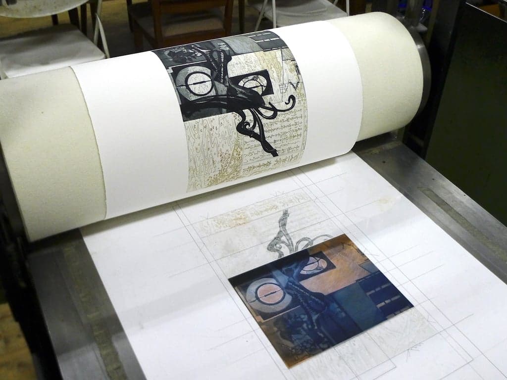 Démonstration englobant le processus complet d'une impression d'estampe, du procédé de création des matrices de cuivre jusqu'à l'impression finale en bichromie.