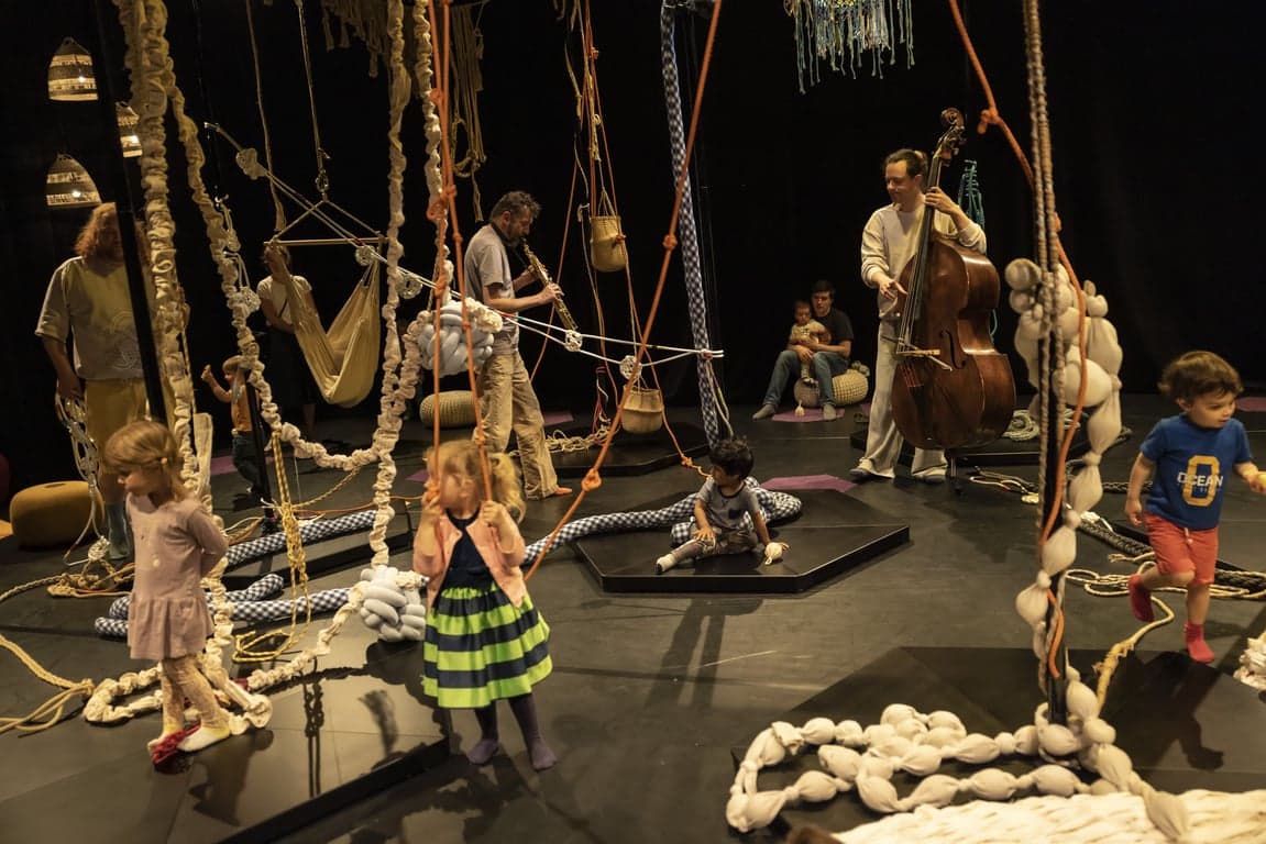 « Knuet » signifie « nœud » en luxembourgeois. Sur le plateau, un monde fascinant de cordes s’offre aux tout·es-petit·es spectateur·ices : des cordages pour relier, des ficelles comme rideaux, des tunnels, des berceaux tressés, des balançoires. Bientôt ce terrain de jeux s’anime sous l’impulsion de deux musiciens et d’une danseuse. Cela tournoie, cela vibre au rythme d’une improvisation partagée entre les artistes et les tout·es-petit·es qui s’aventurent dans l’installation. Une expérience follement joyeuse et libre.