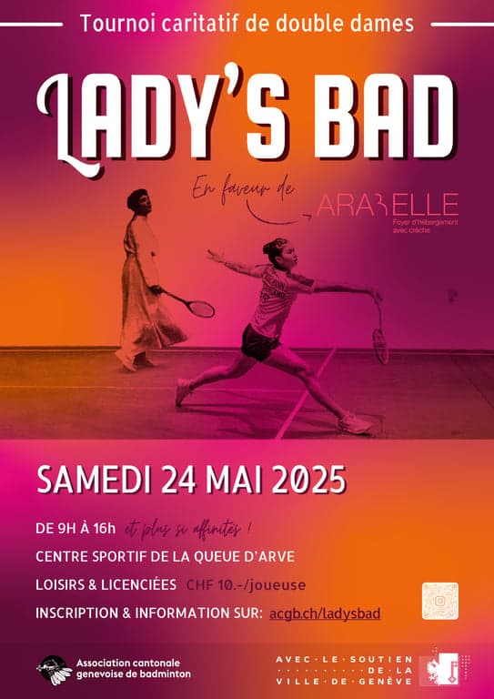 Dans le cadre de la promotion du sport féminin, un comité de l’ACGB (Association Cantonale Genevoise de Badminton), soutenu par la Ville de Genève, organise la 3ᵉ édition de Lady’s Bad, un tournoi de double-dames ouvert à tous niveaux. L’objectif est de réunir les joueuses pour un moment sportif, convivial et ludique. Tous les bénéfices seront reversés à l’association genevoise « Foyer Arabelle », qui propose hébergement, crèche et accompagnement socio-éducatif aux femmes avec ou sans enfant.