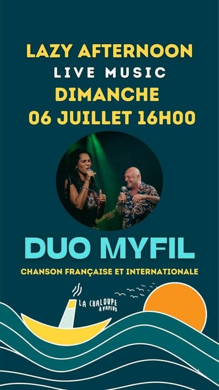 Le Duo Myfil, composé de Myriam (chanteuse réunionnaise à la voix puissante) et Philippe (guitariste autodidacte et multi-casquettes), vous invite à un concert tout en simplicité, chaleur et spontanéité.
