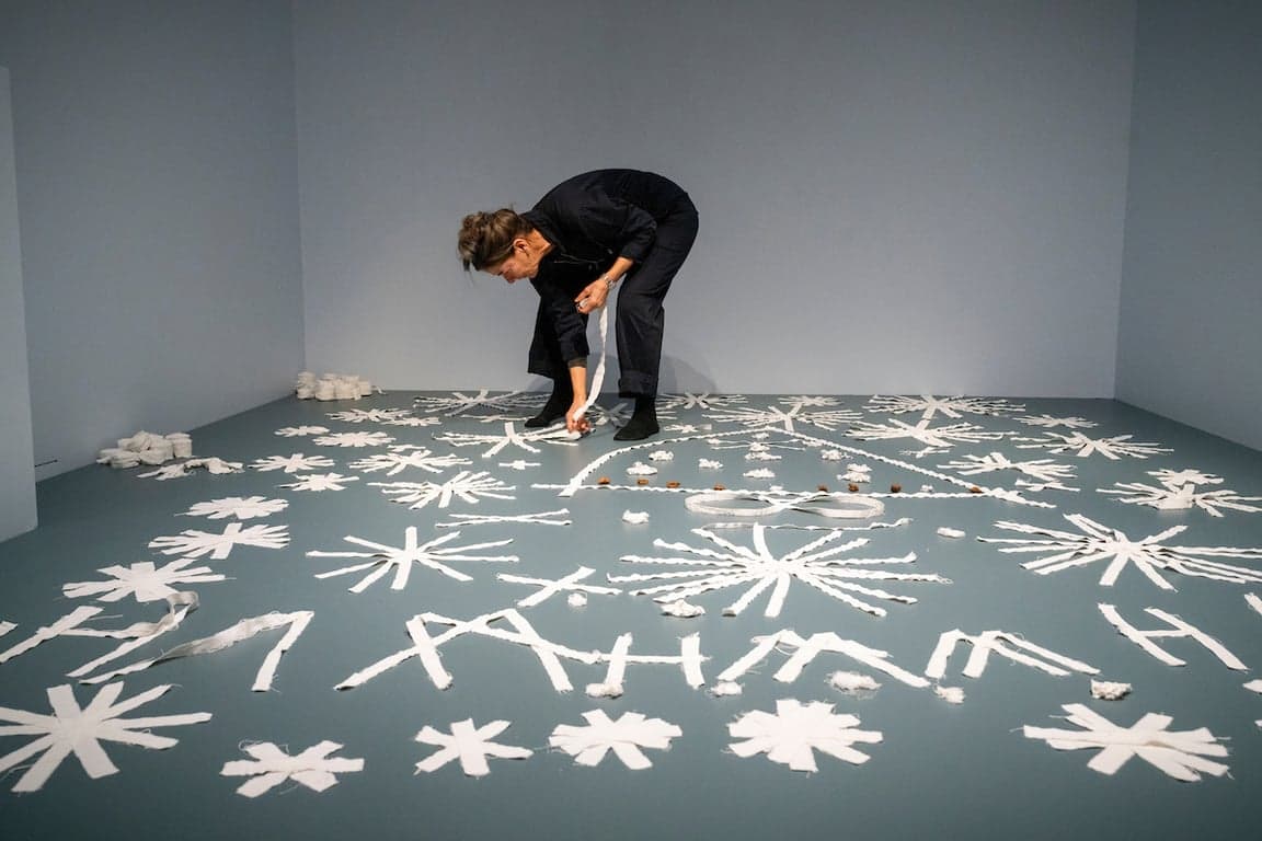 Une robe brodée conçue pour rejoindre un défunt dans l’au-delà, des taches violettes et carmin pour dialoguer avec des esprits, un théâtre avec des visages dessinés pour communiquer avec ses proches disparus. Ces créatrices interrogent l’immatériel, la mort et l’au-delà. Telles sont les quelques-unes des œuvres à découvrir dans ce parcours.