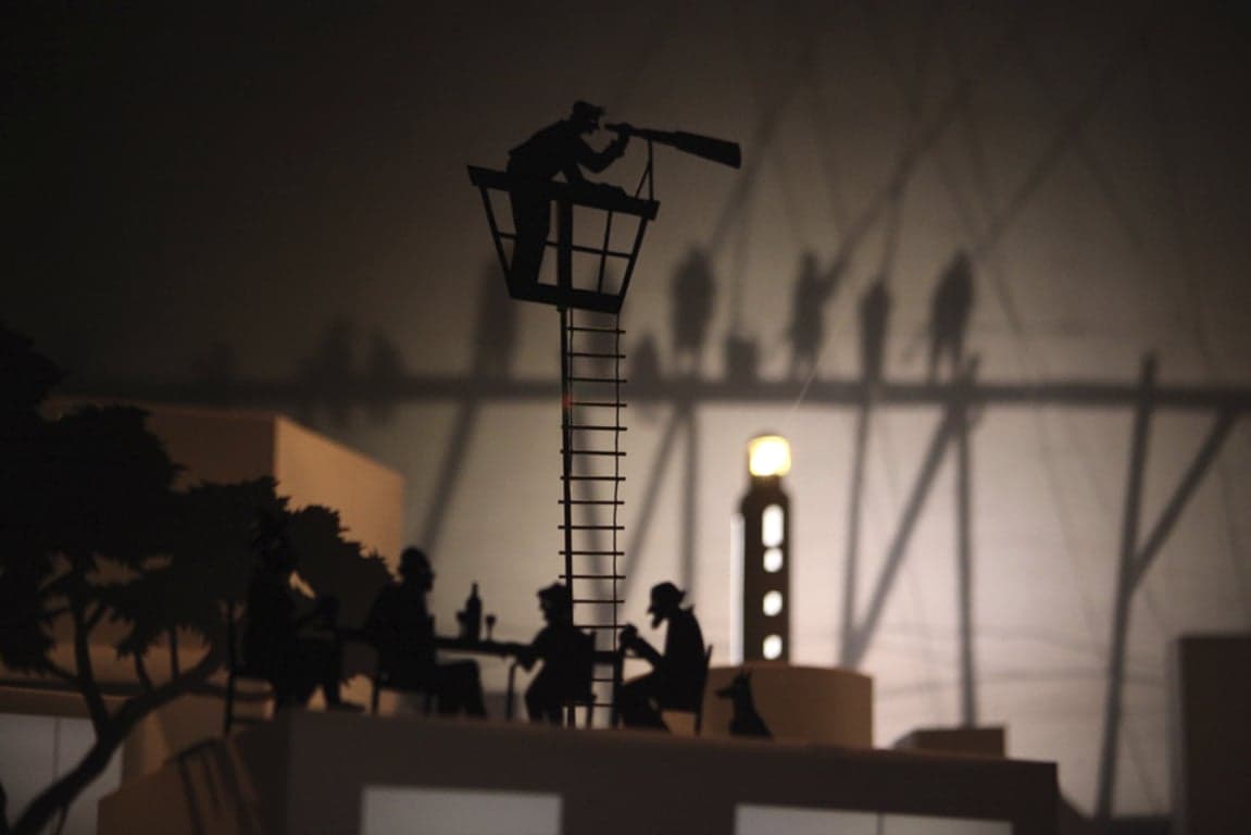 Cette histoire est mise en scène dans une maquette spectaculaire animée par des jeux d’ombres et de lumières, terrain de jeu pour quatre marionnettistes et deux musiciens qui entraînent les spectateurs dans cette dérive imaginaire.