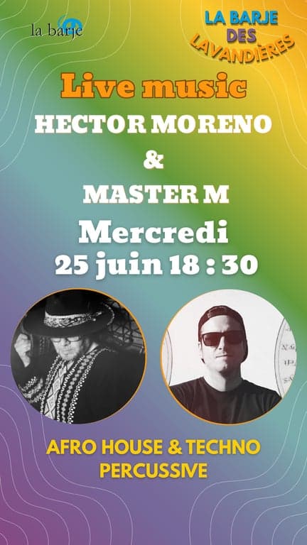 Ce 25 juin, La Barje vous invite à un voyage sonore inédit avec le duo Mariano Reale & Hector Moreno. Entre les beats immersifs d’un DJ set afro house/techno mélodique et la puissance des percussions en live, c’est une performance fusion qui vous attend sur la Promenade des Lavandières.