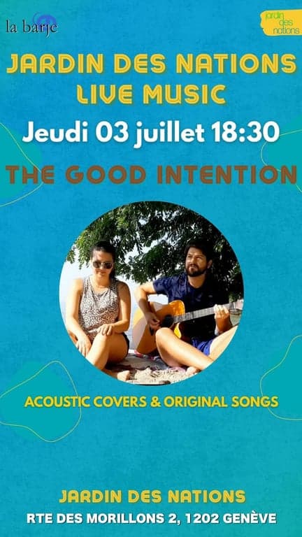Laissez-vous emporter par les sonorités feutrées de The Good Intentions, un duo acoustique qui revisite avec douceur les grands classiques de la pop et du rock tout en distillant leurs propres compositions. Dans l’écrin verdoyant du Jardin des Nations, leur musique authentique et lumineuse résonne comme une invitation à la détente et au partage.