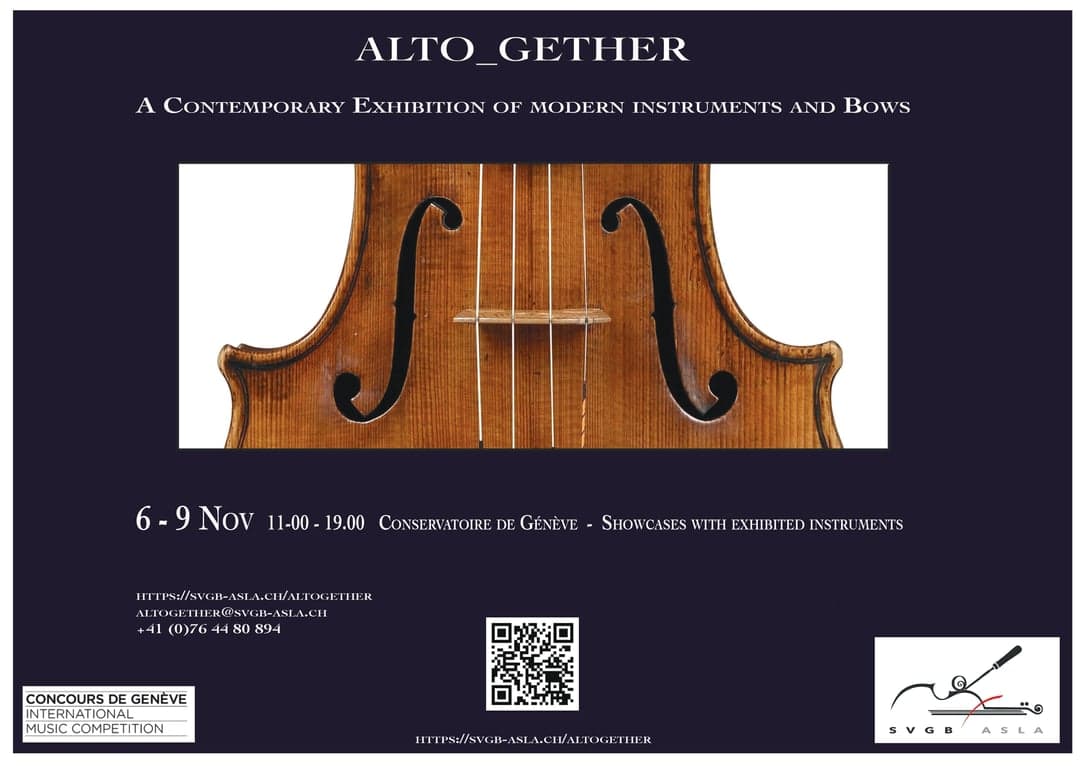 À l’occasion du Concours International d’Alto de Genève, l’Association Suisse des Luthiers et Archetiers organise une exposition de lutherie contemporaine. L’exposition se tiendra au Conservatoire de Genève du 6 au 9 novembre et réunira une vingtaine de luthier(ère)s et archetier(ère)s de toute la Suisse, qui exposeront, dans un espace organisé comme une galerie, un alto chacun (et des archets). On y trouvera également un endroit dédié à l’explication de la construction d’un instrument pour les néophytes.