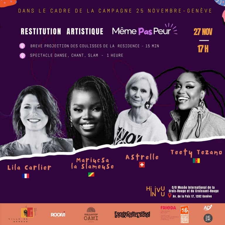 #MPP - "Même Pas Peur" est une résidence artistique internationale initiée par l'artiste et militante sociale Teety Tezano, réunissant quatre artistes venues de Suisse, du Cameroun, de France et du Congo. Pensée comme un espace de création, libération et transformations, ce projet place la déconstruction de la peur au coeur de sa démarche artistique et politique. Il s'inscrit dans le cadre de la lutte contre les violences faites aux femmes, en particulier autour de la thématique du culte de la peur, ce mécanisme psychologique et culture qui enferme les femmes dans le silence, la honte, l'isolation, la soumission. La résidence se déroule en Suisse afin de garantir un cadre sécurisé et libre, indispensable aux artistes venant de pays où dénoncer les violences (féminicides, abus, oppression) est dangereux ou impossible.