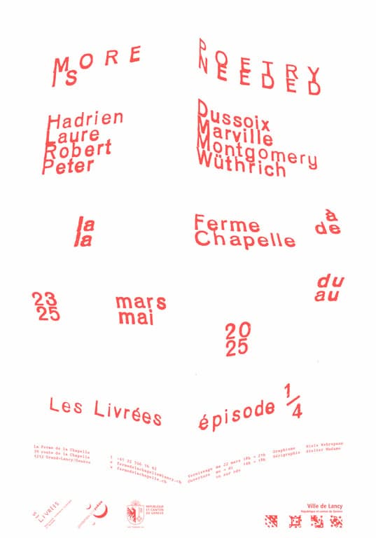 Pour ouvrir en beauté l'exposition "More Poetry is Needed", qui réunit Laure Marville, Peter Wüthrich, Robert Montgomery et le lancéen Hadrien Dussoix, Les Livrées vous invitent à un concert unique : Meimuna et AbSTRAL compost ont mis en musique des textes de poètes romands contemporains et bien vivants, dont la genevoise Pierrine Poget.