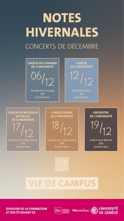 L'Université de Genève compte de multiples formations musicales, dont certaines se produisent pour vous, en ce mois de décembre, pour l'accompagner de ses plus belles notes hivernales :
