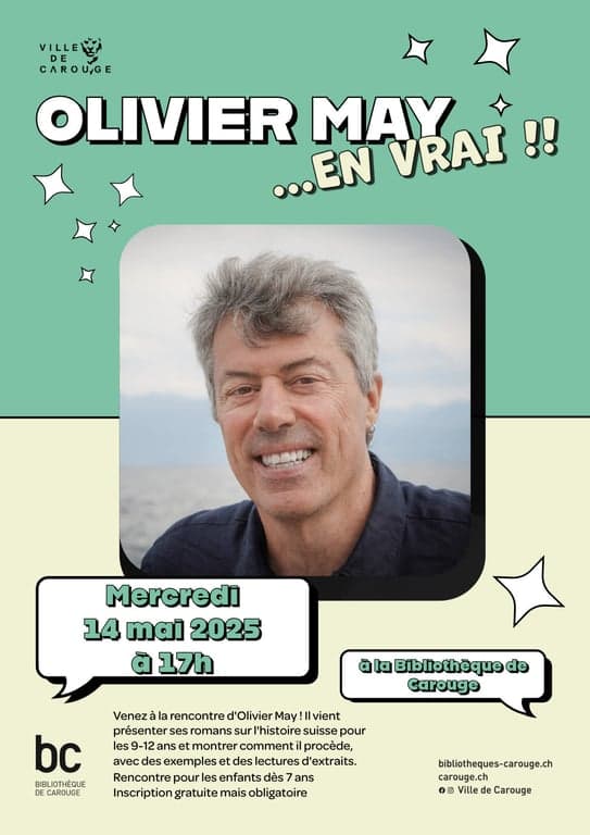 Dès 7 ans, inscription gratuite mais obligatoire : https://www.bibliotheques-carouge.ch/Default/doc/CALENDAR/350/olivier-may-en-vrai