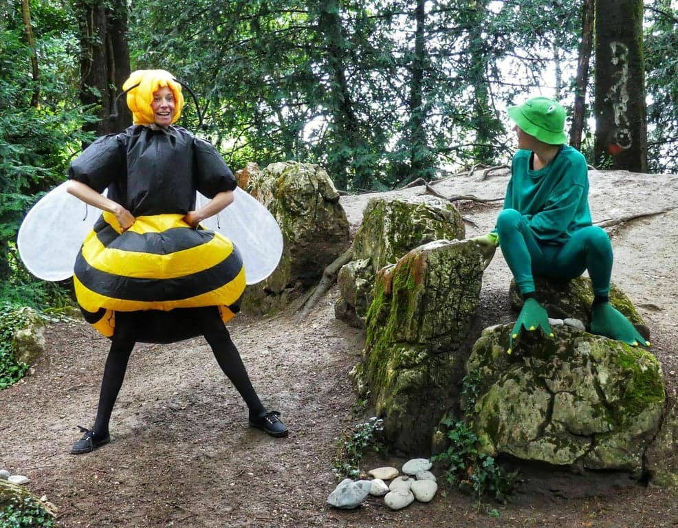 Plouf et Splatsch, deux grenouilles, se posent des questions. Je dis deux grenouilles, mais c’est plutôt une grenouille et une abeille. Enfin une grenouille-abeille … une greneille … une abouille ! A chaque pourquoi sa réponse. Le spectacle tente de répondre aux grandes et aux petites questions de la vie. Toutes ! Presque …