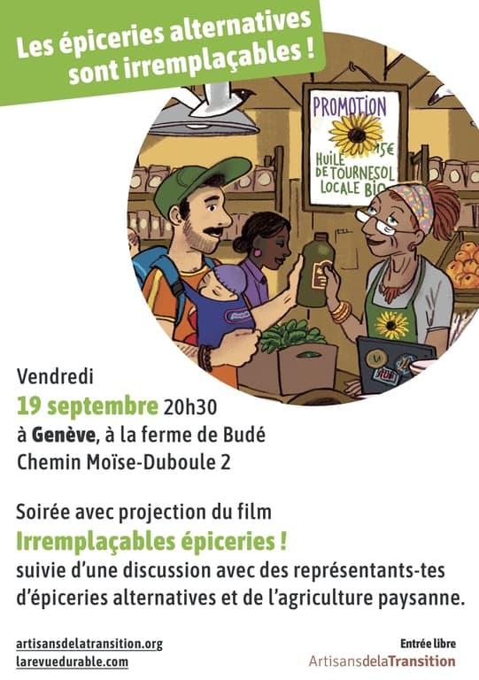 Le documentaire Irremplaçables épiceries ! réalisé par Jacques Mirenowicz présente en 47 minutes la façon dont les épiceries alternatives de Suisse romande s’approvisionnent en donnant la priorité aux fermes en agroécologie et aux ateliers de transformation artisanaux, garantissent la transparence sur leurs marges raisonnables, évitent le gaspillage alimentaire, luttent contre les emballages, assurent un contact privilégié avec la clientèle et sont en phase avec l’agriculture paysanne.