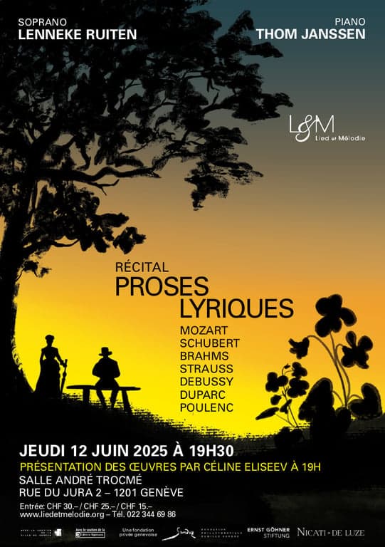 Ce récital sera l’occasion d’entendre certaines des mélodies de prédilection de la soprano : en première partie, un choix de lieder de Mozart, Schubert, Brahms et Strauss ; puis un chef-d’œuvre de Debussy rarement donné, le superbe cycle des Proses Lyriques. Trois mélodies de Duparc ainsi que les virtuoses Trois poèmes de Louise de Vilmorin de Poulenc viendront clore la soirée.