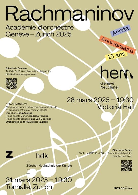 La Haute école de musique de Genève et la Zürcher Hochschule der Künste s’unissent pour un concert consacré à Sergueï Rachmaninov, l’un des derniers grands romantiques. Pianiste virtuose et compositeur de renom, il a marqué l’histoire de la musique classique par des œuvres intemporelles qui allient virtuosité, profondeur et richesse mélodique.