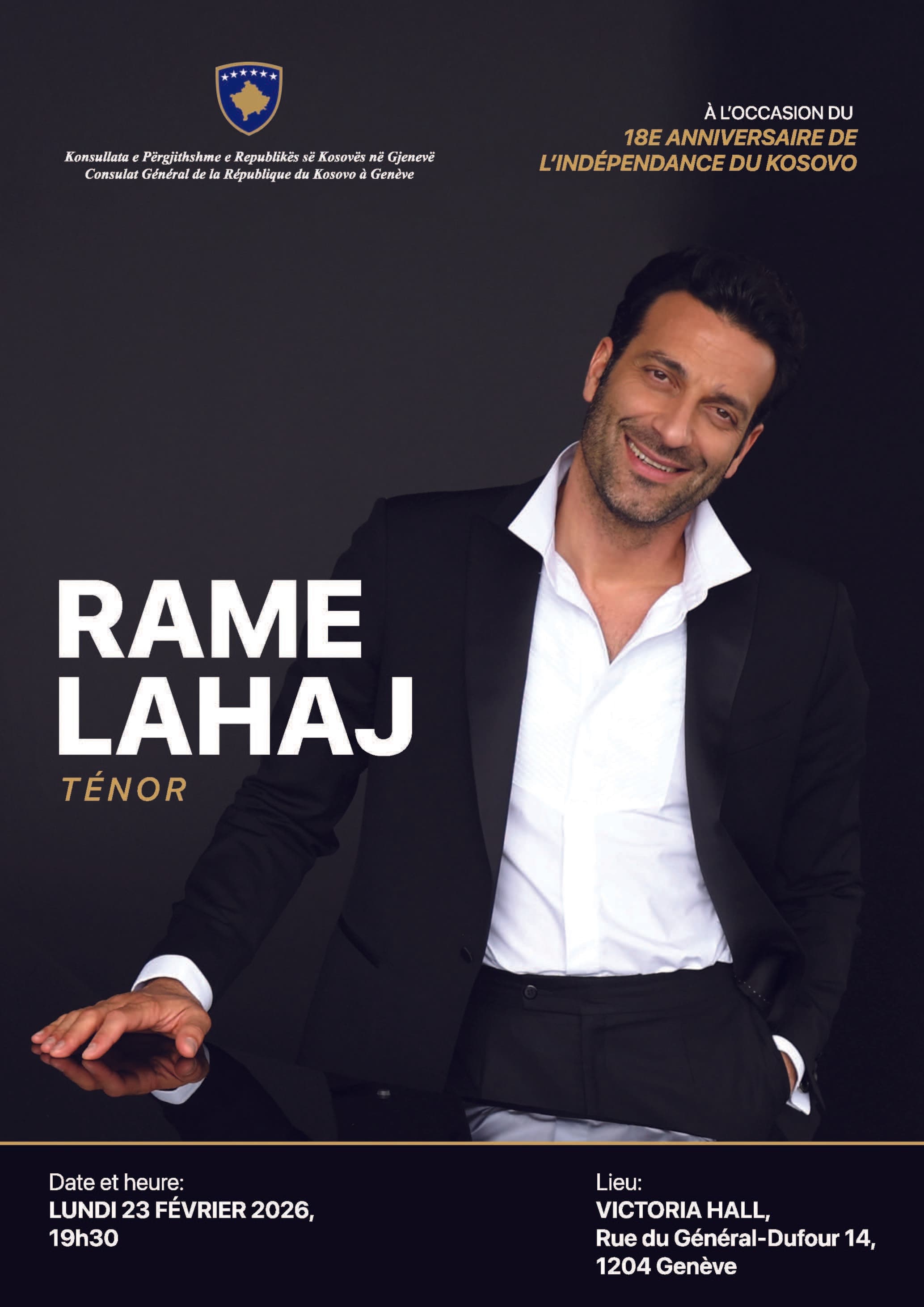 Le 23 février 2026, ne manquez pas le concert du ténor Rame Lahaj au Victoria Hall, organisé par le Consulat général du Kosovo à Genève à l’occasion du 18ᵉ anniversaire de l’indépendance du Kosovo.