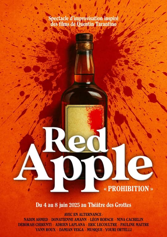 Sur scène, les comédien·nes s’inspirent de propositions du public avant de débuter une représentation unique, reprenant sur scène les codes et le style des films de Tarantino. Red Apple est un spectacle unique en Suisse. Dix improvisateur·rices ont étudié ses longs-métrages et expérimenté ensemble, afin d’improviser des scènes à la manière de Tarantino. Comment construire des histoires à sa façon, interpréter ses personnages et réinventer ses dialogues si particuliers? Comment réaliser une scène de tension virtuose où la violence crue côtoie parfois l’humour? Comment jouer tout ça, sans que rien ne soit écrit au préalable? Un défi forcément passionnant.